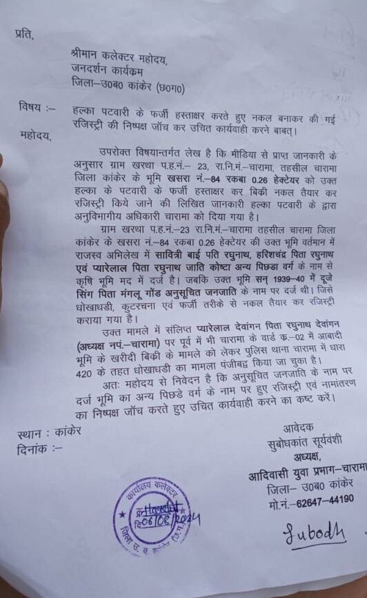 अतः कलेक्टर से निवेदन है कि अनुसूचित जनजाति के नाम पर दर्ज भूमि का अन्य पिछडे वर्ग के नाम पर हुए रजिस्ट्री एवं नामांतरण का निष्पक्ष जाँच की जाये की उक्त आदिवासी की जमीन ओबीसी के नाम पर कैसे दर्ज हुई, साथ ही हल्का पटवारी शासकीय कर्मचारी के सील और हस्ताक्षर का फर्जी करने वालो पर धारा 420 के तहत कार्यवाही की जाये।