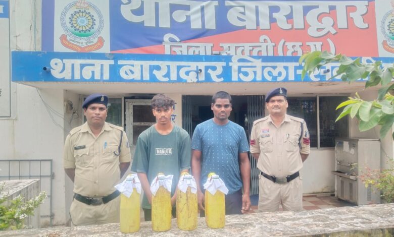 जिला सकती (छ0ग0) क्षेत्र मे चल रहें अवैध जुआ/सटटा, अवैध गांजा व शराब बिक्री एवं परिवहन करने वाले आपराधियों पर अकुंश लगाने हेतु पुलिस अधीक्षक सक्ती सुश्री अंकिता शर्मा महोदया द्वारा अधिक से अधिक कार्यवाही करने की निर्देश पर थाना प्रभारी निरीक्षक प्रवीण राजपूत थाना प्रभारी बाराद्वार द्वारा दिनांक 02.09.25 को मुखबीर की सुचना पर ग्राम रायपुरा भांठापारा एवं मुक्ताराजा में अलग अलग टीम बनाकर रेड कार्यवाही कर आरोपी. कन्हाटई सतनामी पिता गजानंद उम्र 31 साल निवासी रायपुरा भांठापारा थाना बाराद्वार जिला सक्ती(छग) एवं अनुज कुमार साण्डे पिता स्व. सुरेन्द्र कुमार साण्डे उम्र 18 साल 05 माह निवासी मुक्ताराजा थाना बाराद्वार जिला सकती (छ0ग0) कब्जे से जुमला 15 लीटर कच्ची महुआ शराब भरी हुई कीमति 1500/- रूपये को जप्त किया गया जिसे आबकारी एक्ट के तहत विधिवत कार्यवाही कर आरोेपीयो को गिरफ्तार कर न्यायिक रिमांड पर भेजा गया।