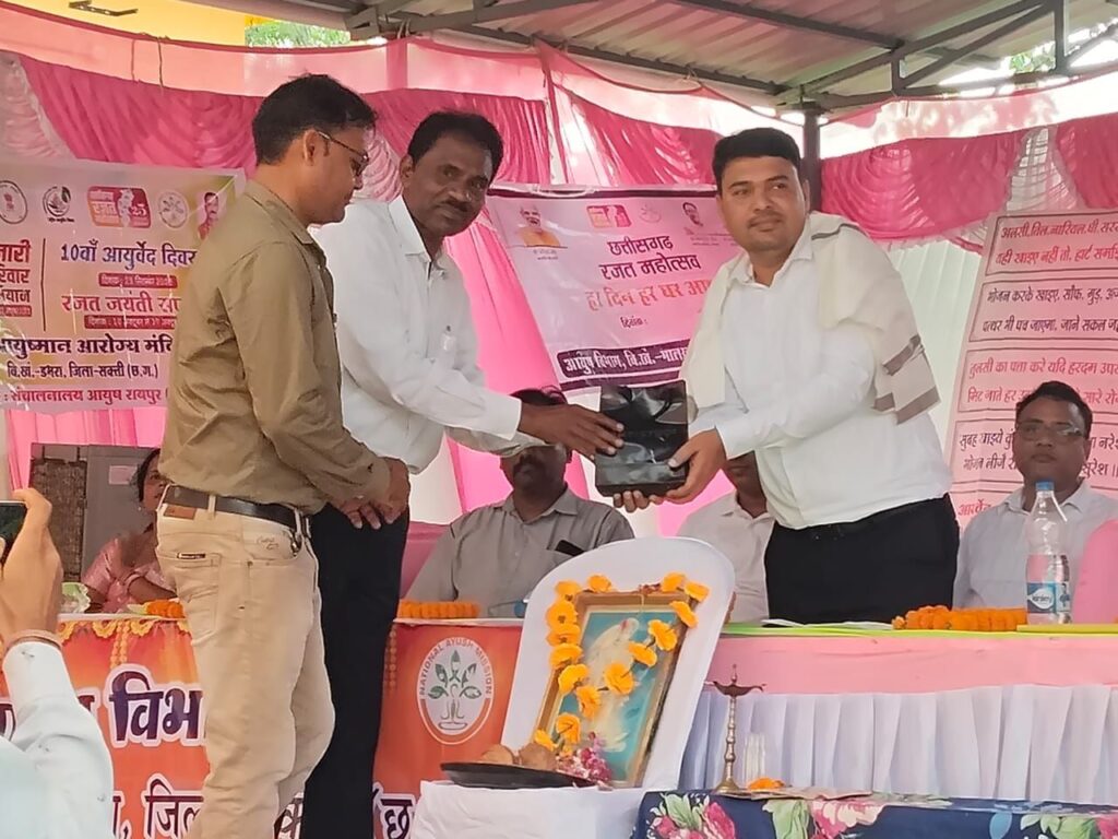 आयुष मेला का संचालन जिला *नोडल अधिकारी डॉ अनिल पटेल ने किया तो वहीं वरिष्ठ आयुर्वेद चिकित्सा अधिकारी जवाहर बंजारे* ने अतिथियों के प्रति आभार व्यक्त किया। इन पलों में जिले में कार्यरत आयुर्वेद चिकित्सा कर्मचारियों को उनके उत्कृष्ट सेवा के लिए अतिथियों ने प्रशस्ति पत्र देकर सम्मानित किया तो वहीं सपोस आयुर्वेद औषधालय के *चिकित्सा अधिकारी डॉ छत्रपति पटेल* के जन्मदिवस पर उपस्थित जनों केक काटकर बधाई देते हुए उनके उज्जवल भविष्य हेतु शुभ कामनाएं दिया।