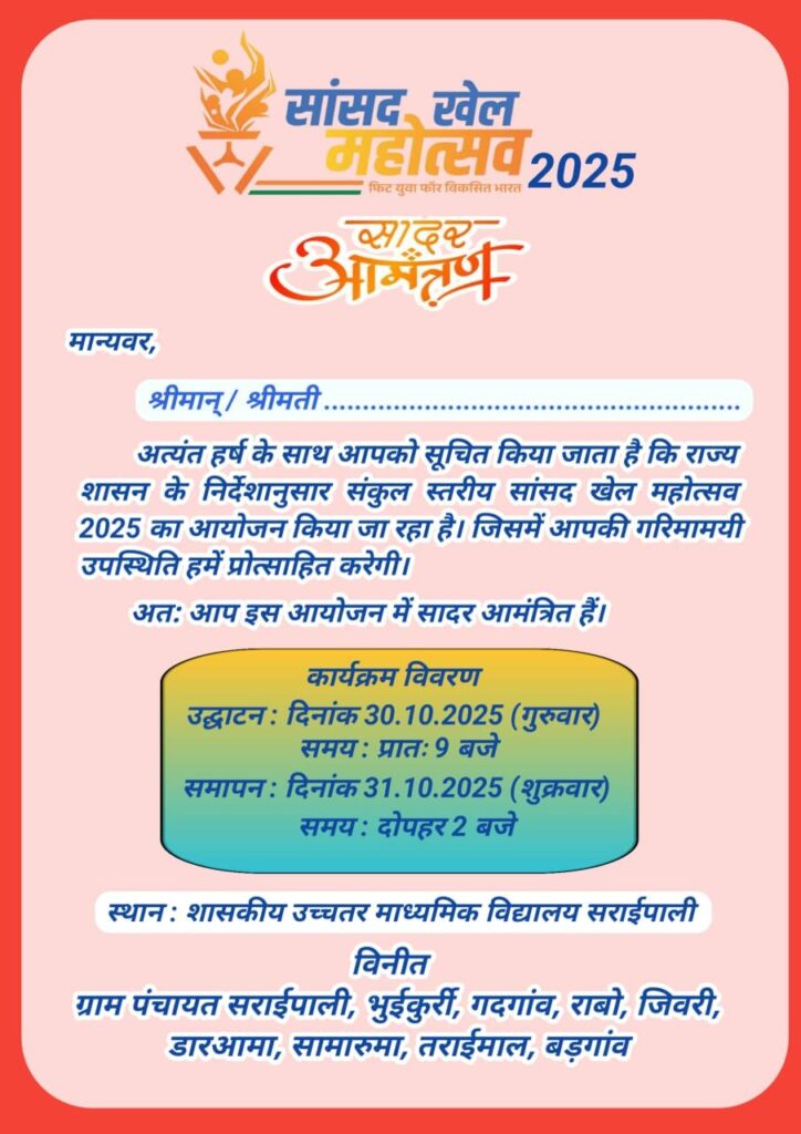 ग्राम पंचायत सराईपाली के सरपंच श्री ईश्वर किसान के अध्यक्षता एवं संकुल प्राचार्य श्री प्रमोद वर्मा की मार्गदर्शन तथा श्री सुभाष मित्तल एवं श्री महेश भाई के संरक्षण में इसी खेल महोत्सव को सफल करने हेतु सभी पहलुओं पर विशेष चर्चा कर आपसी सहमति दी गईl
