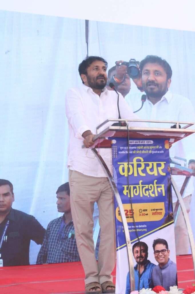 कोचिंग वाले लोग, गरीब बच्चों को आगे बढ़ते देखकर मुझ पर पांच बार हमला कराये। एक अपराधी ने फोन करके धमकाने की कोशिश भी की। केबीसी में अभिनेता अमिताभ बच्चन जी ने 25 लाख रुपए दिलवाये। मेरे जीवनी का लोकार्पण राष्ट्रपति प्रणब मुखर्जी ने किया और राष्ट्रपति द्रौपदी मुर्मू ने मुझे पद्मश्री अवार्ड दिया। उन्होंने कहा कि जब मैं बुजुर्ग हो जाऊंगा और आज यहां उपस्थित बच्चों में से कोई किसी क्षेत्र का अवार्ड लेकर पुरस्कार के अपने इंटरव्यू में कहे कि, इस सफलता को पाने का विचार मुझे सरिया में आयोजित कैरियर मार्गदर्शन में आनंद कुमार से आया, वो मेरे लिए पुरस्कार होगा।