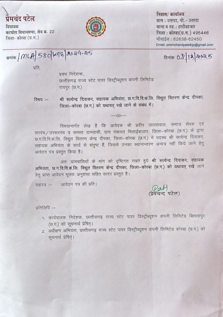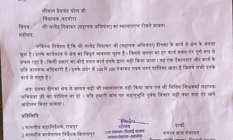 दीपका क्षेत्र के लोकप्रिय सहायक अभियंता सत्येंद्र दिवाकर के प्रस्तावित स्थानांतरण पर भिलाई बाज़ार सहित आसपास के ग्रामीण क्षेत्रों में नाराज़गी देखने को मिल रही है। इसी संबंध में ग्राम पंचायत भिलाई बाज़ार ने कटघोरा विधायक प्रेमचंद पटेल को औपचारिक आवेदन सौंपते हुए दिवाकर का ट्रांसफ़र रोकने की मांग की है।
