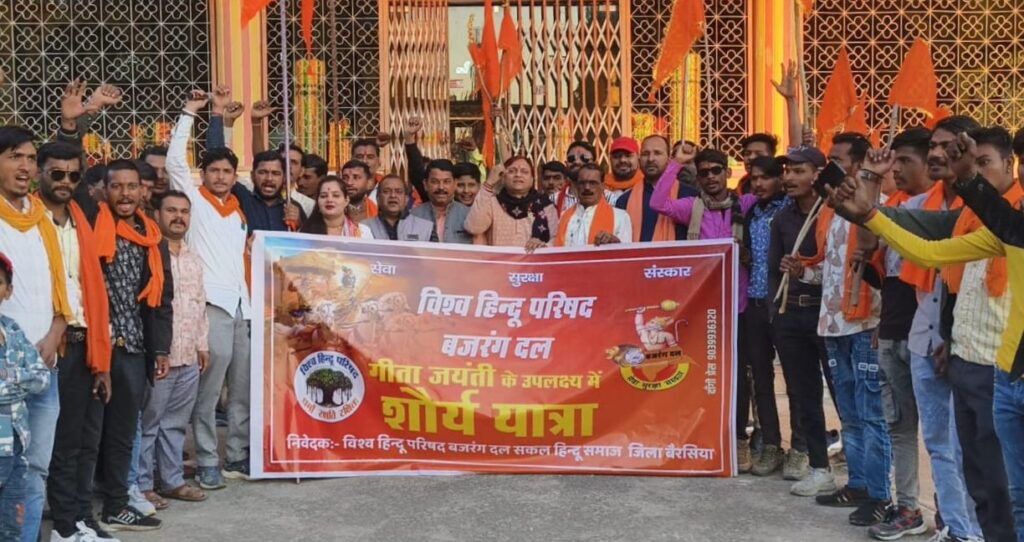 बैरसिया। विश्व हिंदू परिषद एवं बजरंग दल द्वारा बुधवार को नगर बैरसिया में भव्य शौर्य यात्रा निकाली गई। यह यात्रा विश्व हिंदू परिषद जिला अध्यक्ष झनक सिंह राजपूत के नेतृत्व में स्थानीय सांवलिया मंदिर से प्रारंभ हुई और नगर के मुख्य मार्गों से होते हुए राजपूत धर्मशाला, महाराणा प्रताप नगर में पहुँचकर संपन्न हुई।