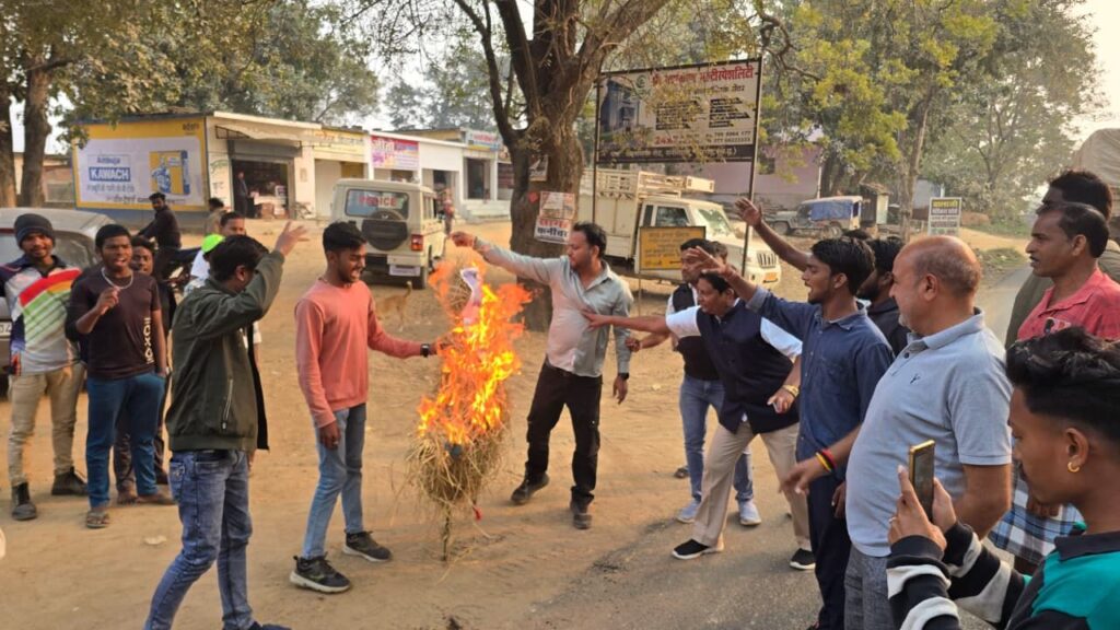एन.एस.यू.आई सारंगढ़ विधानसभा अध्यक्ष अंकित पटेल के नेतृत्व में मुख्यमंत्री विष्णुदेव साय और वित्त मंत्री ओ.पी.चौधरी का पुतला दहन।