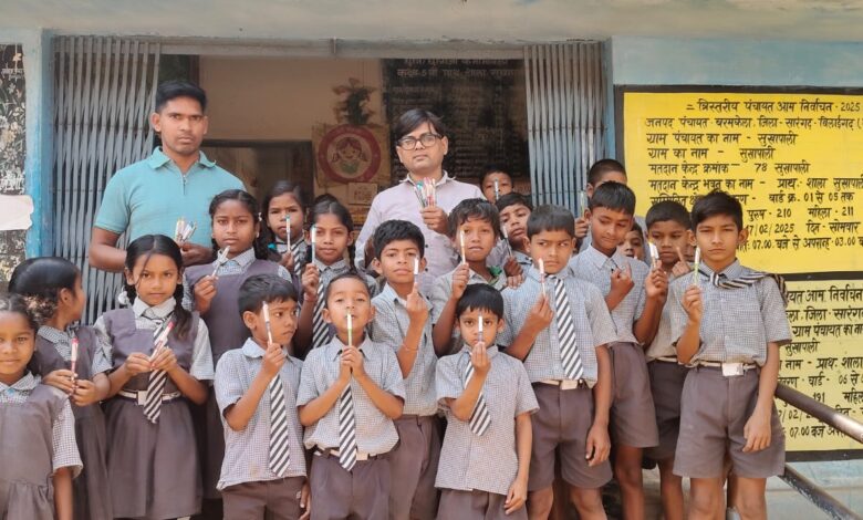 दिनेश साहू बने सामुदायिक सहयोग की मिशाल, बोर्ड परीक्षा पूर्व सभी बच्चों को प्रदान किया गया पेन